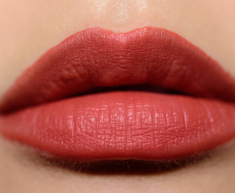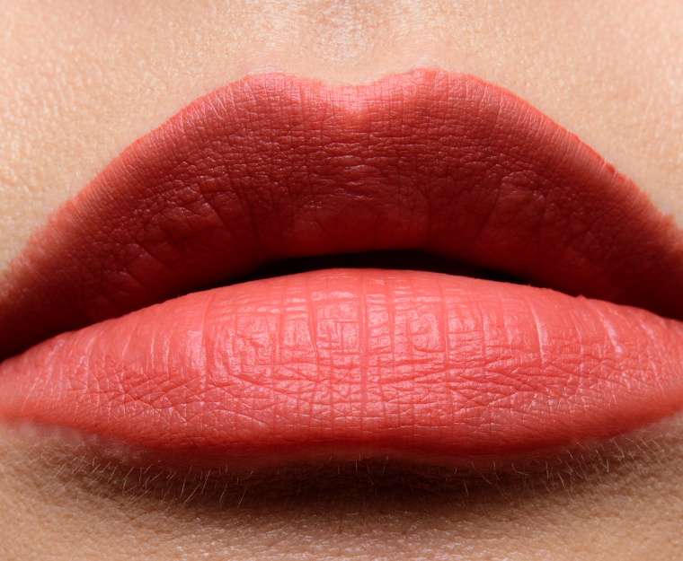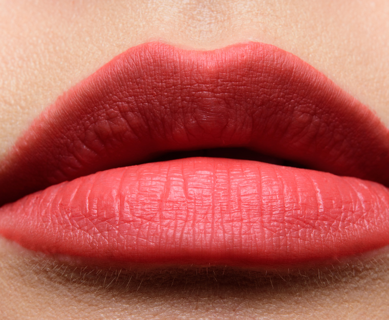 Chanel Rouge Paradoxal (840) Rouge Allure Ink Matte Liquid Lip Colour ($40.00 for 0.2 oz.) is a muted, reddish-coral with warm undertones and a matte finish. It had semi-sheer to medium color coverage in a single layer, which could be built up by applying a second layer after the first one had dried down.