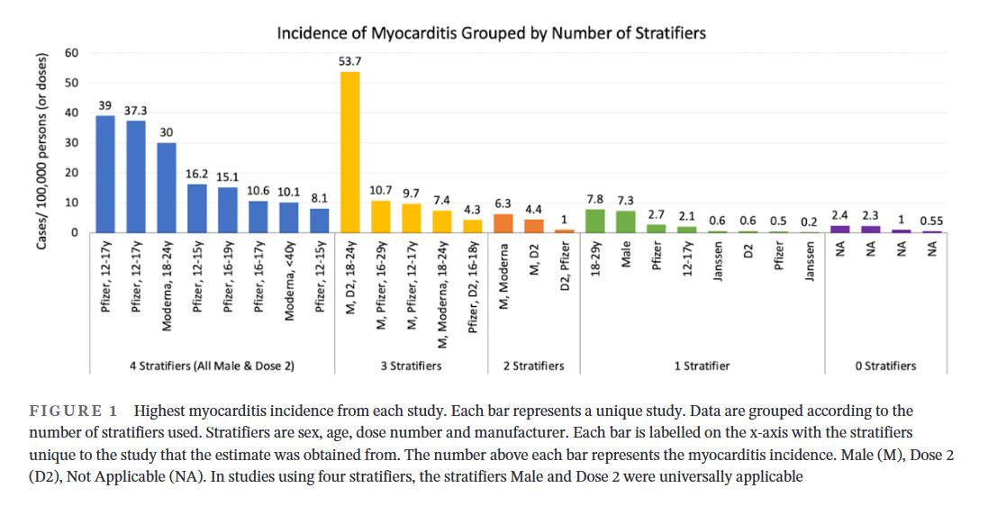 A number of subsequent studies that have attempted to quantify the risk of myocarditis are of variable quality largely because a number of studies used pooled risk estimates across the entire population, ignoring the observation that vaccine myocarditis has its highest incidence in young males. Studies that examine the incidence of myocarditis by age, sex, dose and manufacturer provide the most granularity with regard to risk estimation. A systematic review of vaccine myocarditis papers clearly demonstrates the highest incidence of vaccine myocarditis in young males after dose 2, and also highlights the uselessness of papers that do not stratify incidence of myocarditis by age, sex and dose of vaccine.