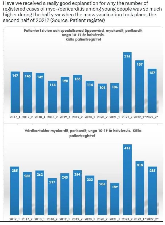 Data obtained by a record request from Sweden clearly demonstrate elevated rates of myocarditis in the time period after initiation of the COVID mass vaccination campaign, with no appreciable increase in the rate of myocarditis during widespread COVID in the year prior.