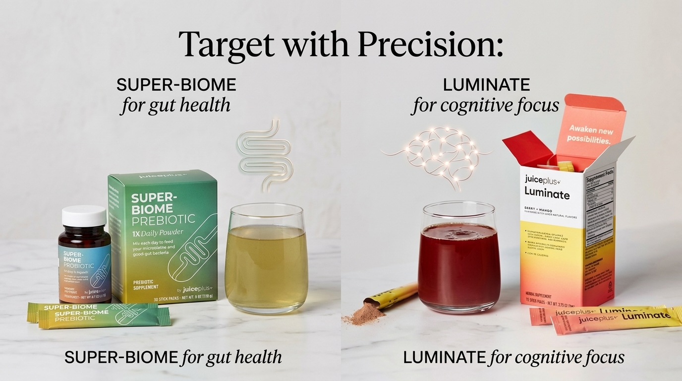3. Target with Precision: Add support where needed, such as Super-Biome for gut health or Luminate for cognitive focus.