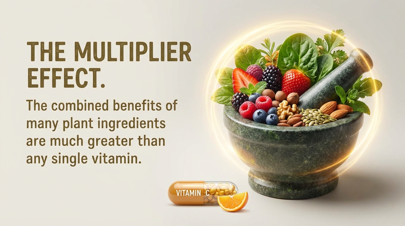 Juice Plus+ Superfood Powder is a blend of 30 different fruits, vegetables, and berries. It includes powerhouses like acerola cherry, spinach, and beetroot. The idea is to provide concentrated nutrition. This is different from taking single vitamins. Science shows that nutrients work best when they are together in their original food form. This is called the "multiplier effect." The combined benefits of many plant ingredients are much greater than any single vitamin.